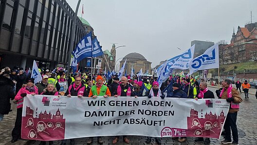 Die Aktion stand unter dem Motto „Wir gehen baden, damit der Norden nicht absäuft“ und war bewusst als geschlossenes Signal des Nordens angelegt. Beschäftigte und Gewerkschaftsvertreterinnen und -vertreter aus Hamburg, Schleswig-Holstein und Niedersachsen zeigten gemeinsam, dass die norddeutschen Länder in der Tarifauseinandersetzung zusammenstehen. Für den dbb niedersachsen waren der Landesvorsitzende Alexander Zimbehl sowie weitere Kolleginnen und Kollegen aus der Landesgeschäftsstelle und aus den Fachgewerkschaften vor Ort und beteiligten sich aktiv an der Protestaktion.